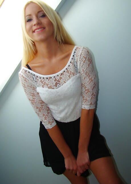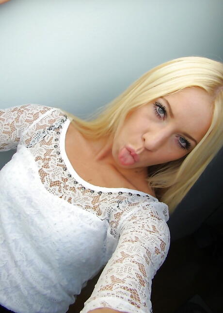 Svelte blond young Carrie in sexy underwear exhibits big tits and shaved pussy