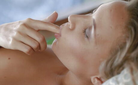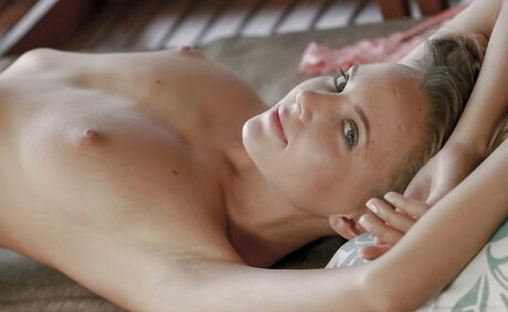 Svelte blonde cutie Kathy Clover in sexy panties denudes tiny tits and hot butt outside