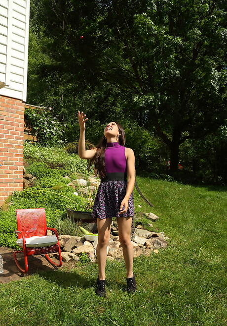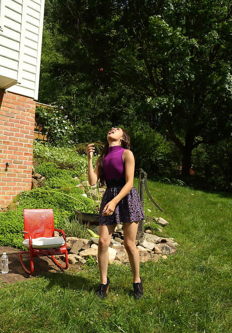 Svelte brunette babe Freya Von Doom exhibits tiny tits and toys her twat outdoor
