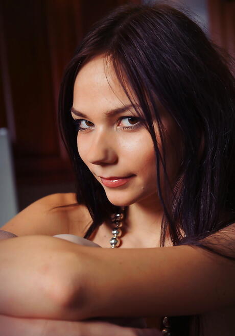 Svelte dark hair teen Mimi bares tiny tits and spreads her legs in the kitchen