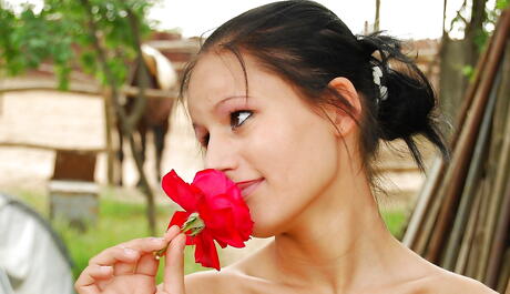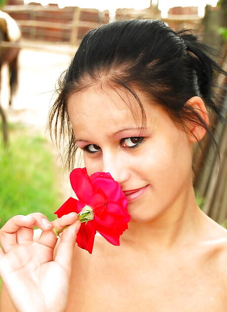 Svelte hungarian dark-haired teen Amanda Baby showing big hooters and spreading her legs outdoor