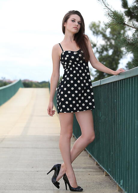 Svelte ukrainian dark-haired Serena Wood in fancy skirt uncovering small tits and butt outdoor