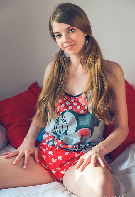Svelte young Kay J in sexy shorts revealing small tits and masturbating