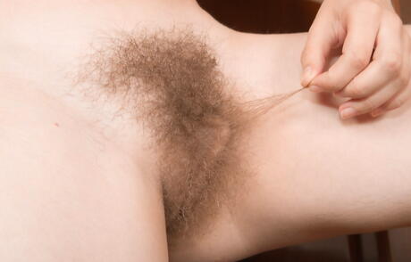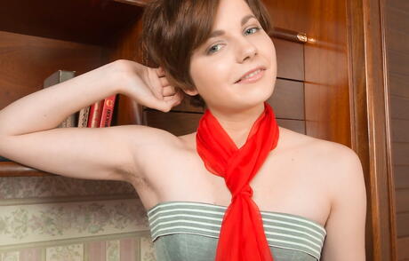 Svelte youthful Aria in sexy shorts reveals tiny tits and hairy pussy