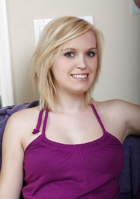 Sylphlike american blonde teen Amanda Bryant in shorts revealing big knockers and spreading her legs