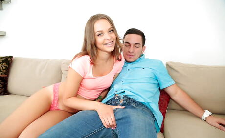 Sylphlike american blonde teen Liza Rowe sucks on big rod and takes a messy cumshot