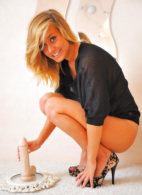 Sylphlike american blonde young Kennedy Leigh in fancy shorts showing big hooters and playing with dildo outside
