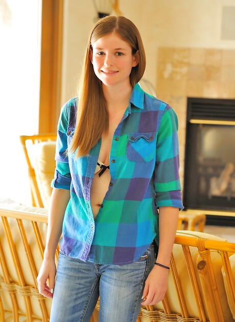 Sylphlike american red-haired young Lara Brookes shows big knockers and butt