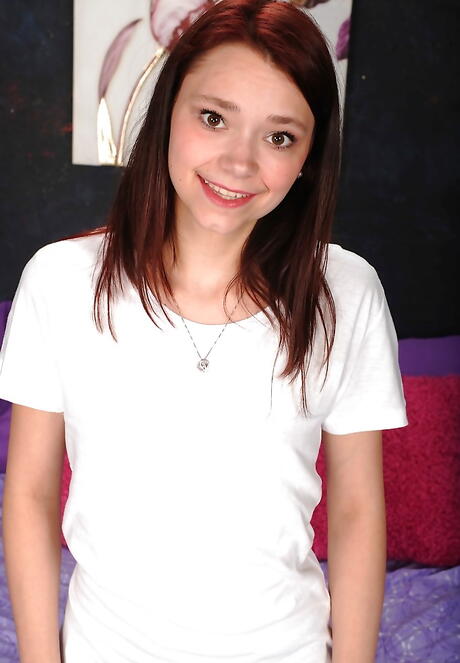 Sylphlike american young Rhaya Shyne in shorts showing tiny tits and spreading her legs