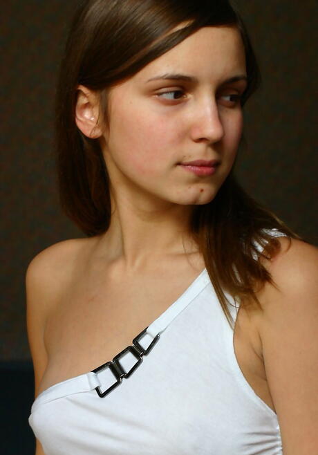 Sylphlike babe Brenda exposes tiny tits and shaved pussy