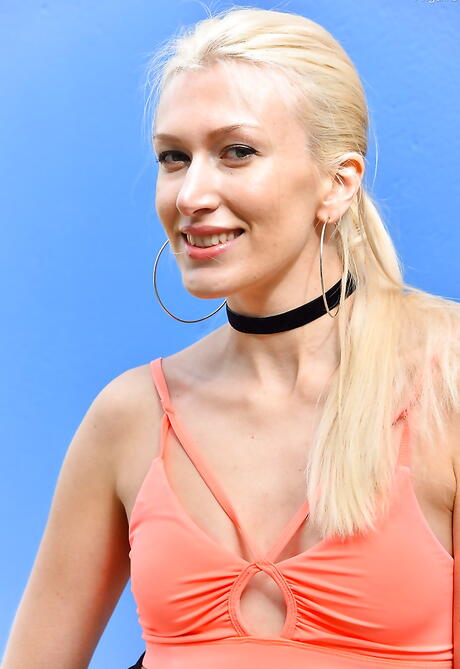 Sylphlike blond milf Angelina showing small tits and spreading her legs outdoor