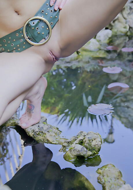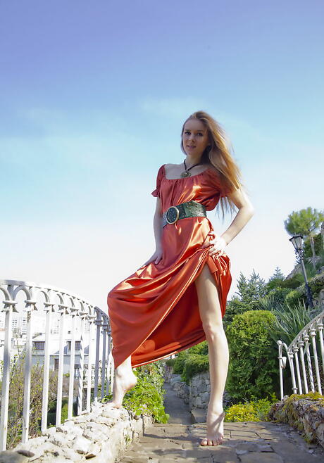 Sylphlike blond youthful Karissa Diamond in nice skirt baring small tits and hairy twat outdoor