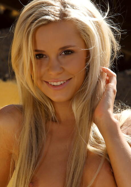 Sylphlike blonde teen Dido A in sexy shorts unveiling small tits and bald pussy outside