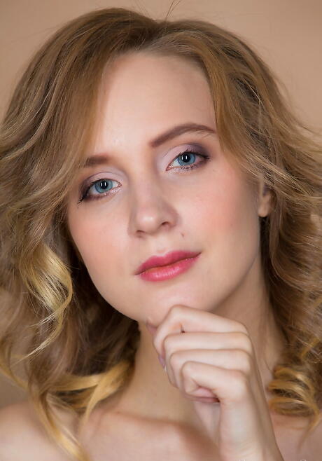Sylphlike blonde youthful Angela in sexy skirt posing