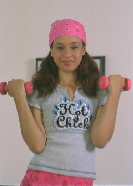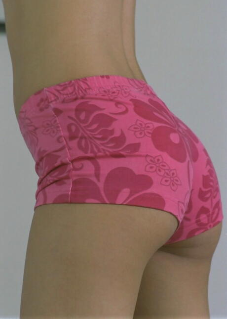 Sylphlike young Janay in sexy shorts denudes tiny tits and spreads her legs