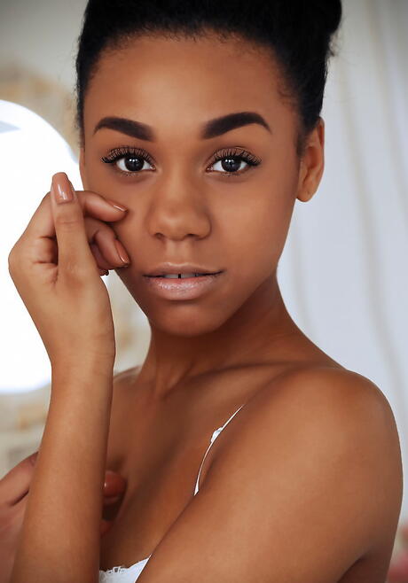 Sylphlike youthful Gana exposes tiny tits and shaved pussy