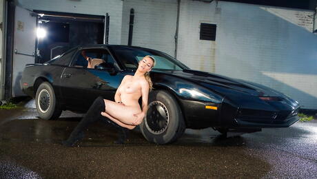 Tempting british blond milf Sophia Knight shows big knockers and spreads her legs outside