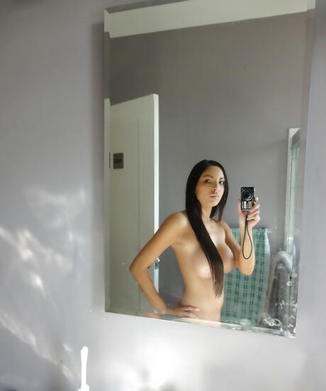 Tempting latin brunette Danni Cole showing big boobies and sexy butt in bathroom