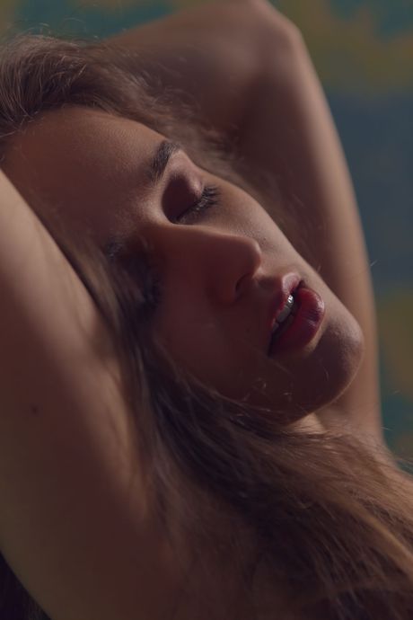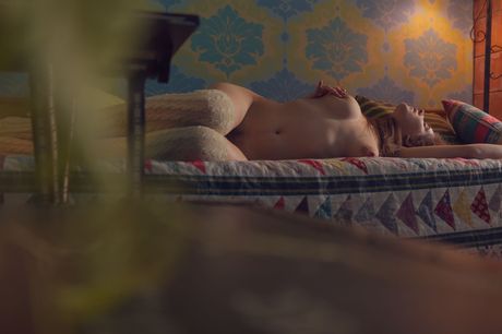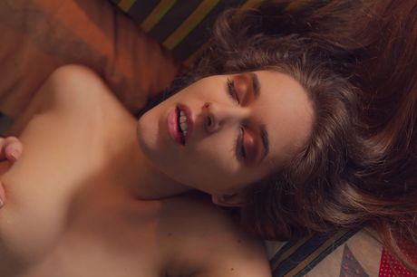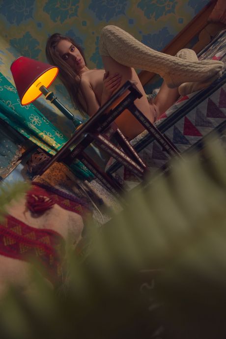 Adorable teen Emily J fingers her pussy in stockings and garters