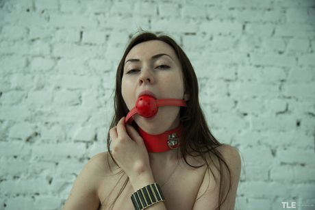 Angela H sticks a vibrator in her pussy while wearing a ball gag on her bed