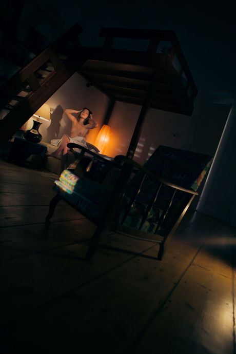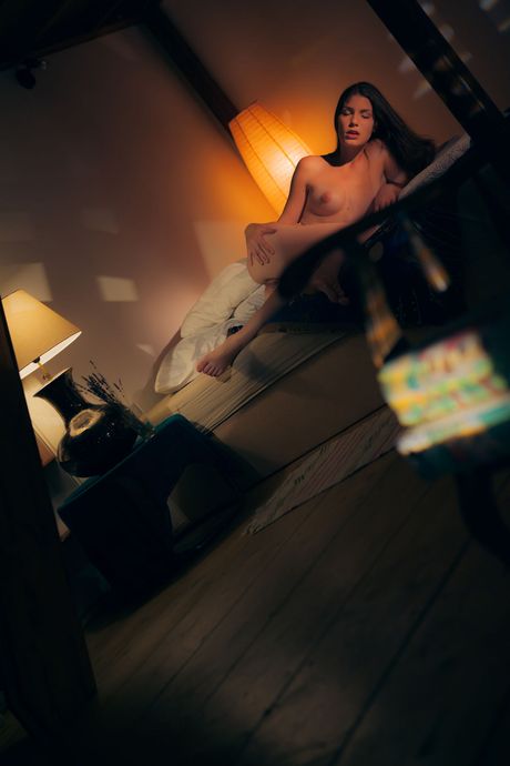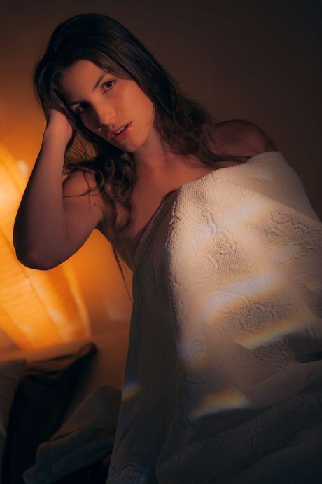 Angelic teen Raeah takes it all off on her bed before fingering her pussy