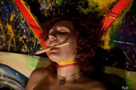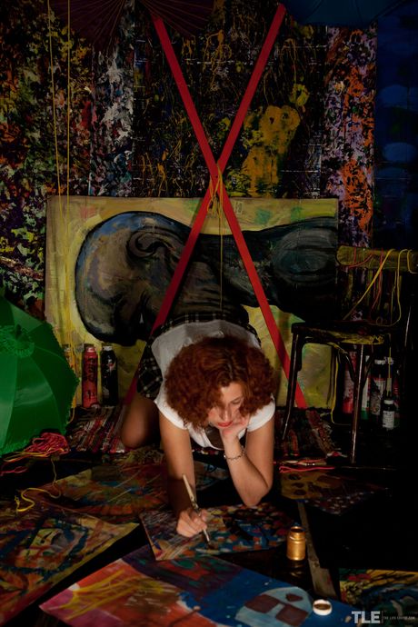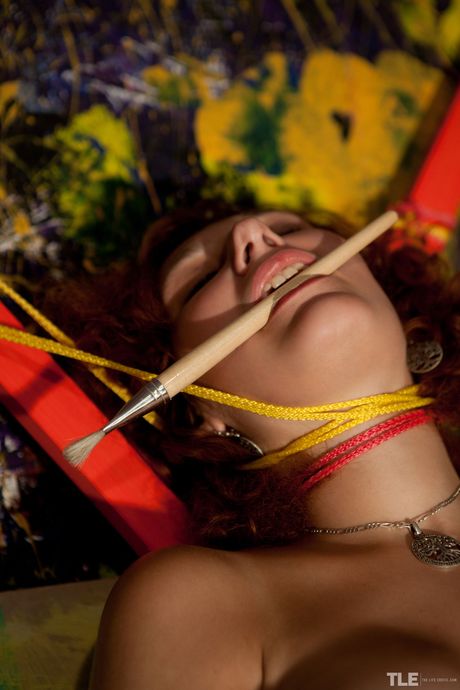 Anika is bound to a wooden chair as she masturbates with a paintbrush
