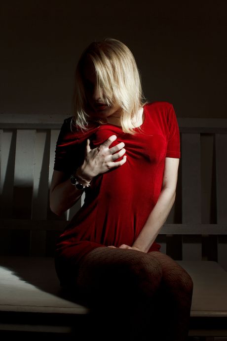 Bella H in fishnet stockings and pantyhose stripping and masturbating