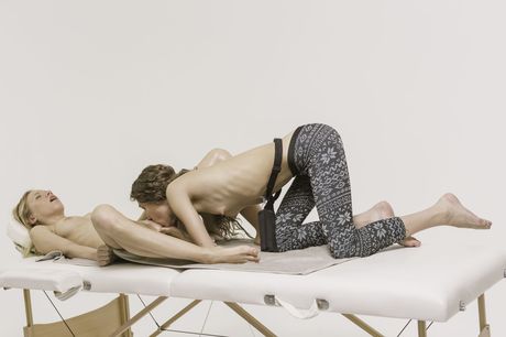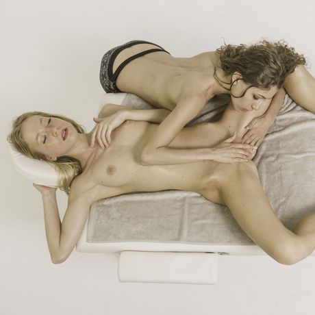 Blonde lesbians Rebel Lynn & Kiara Lord lick pussies while getting oiled up