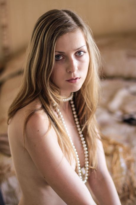 Blonde teen Abigaile removes her lingerie before masturbating in stockings