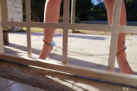 Blonde teen Demy G removes a leather skirt to get totally naked on a patio