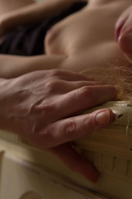 Blonde teen Ksenija A fingers her pussy while posing nude on a table