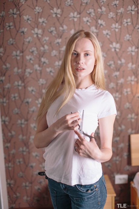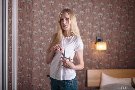 Blonde teen Maria Rubio strips down on a bench in a public park