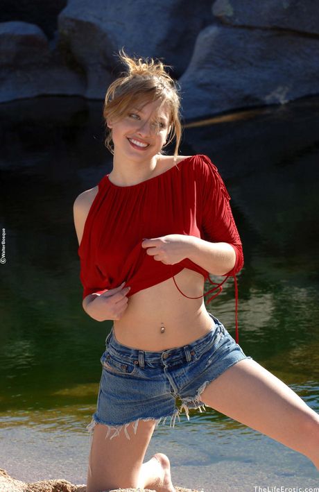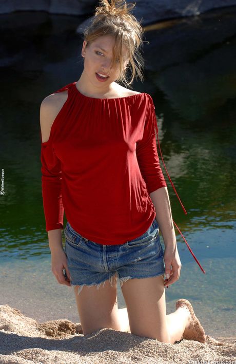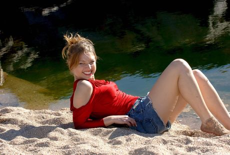 Blonde teen Victoria gets naked on a sandy beach while showing off her flexibility