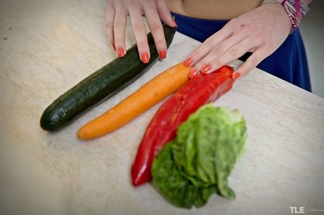Blonde teen Victoria Puppy masturbates with a cucumber on the kitchen counter
