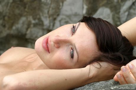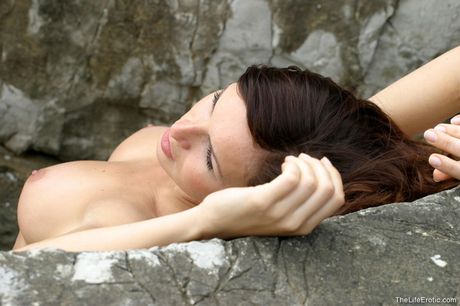 Brunette chick Alexandra removes her bikini to finger her pussy on a patio