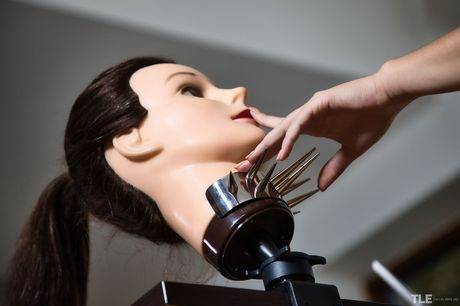 Brunette teen Antonia Sainz pleasures her pussy with a sex toy on a table
