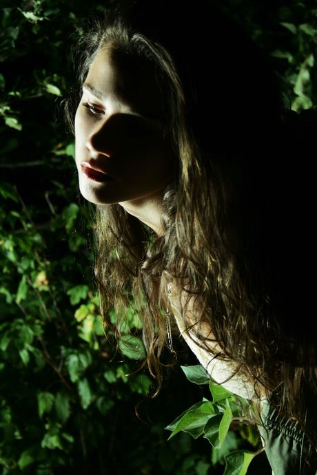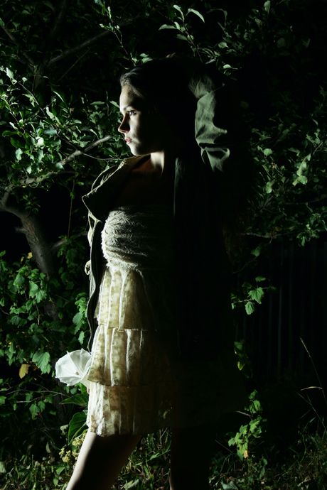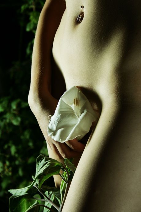Brunette teen Ira I gets naked in a backyard at night while holding a flower