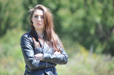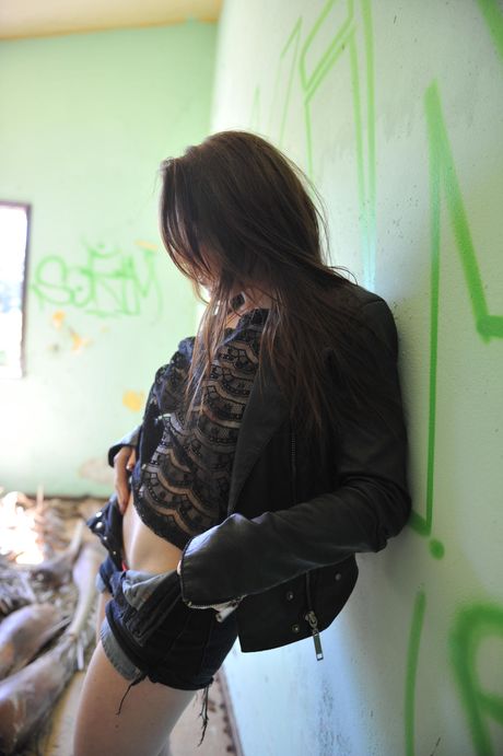 Busty teen Samantha Bentley masturbates while wearing a leather jacket