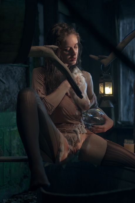 Charming teen Emily J takes a bath in a dungeon while wearing stockings