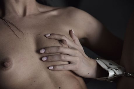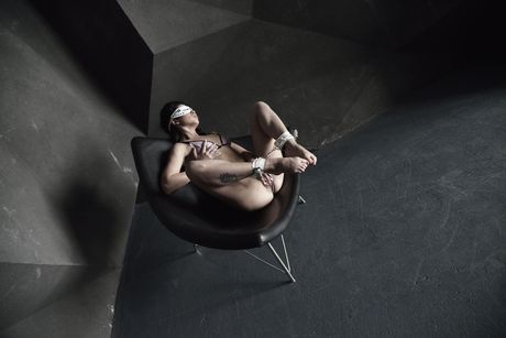 Charming teen Olia removes a blindfold and thong to get naked on a bed
