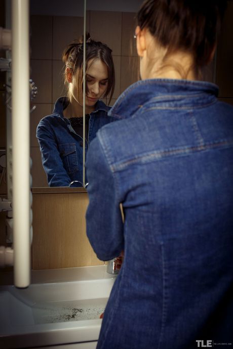 Cute teen Poppy removes her pantyhose to get naked in a bathroom