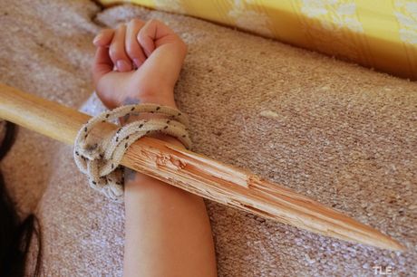 Daisy B is tied up with ropes and a broom handle, she struggles to move