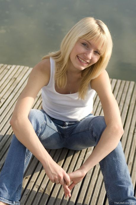 Delightful teen Amanda gets naked on a dock while fishing in the lake