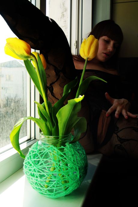 Florens takes off her black catsuit and exhibits nudity in front of the window