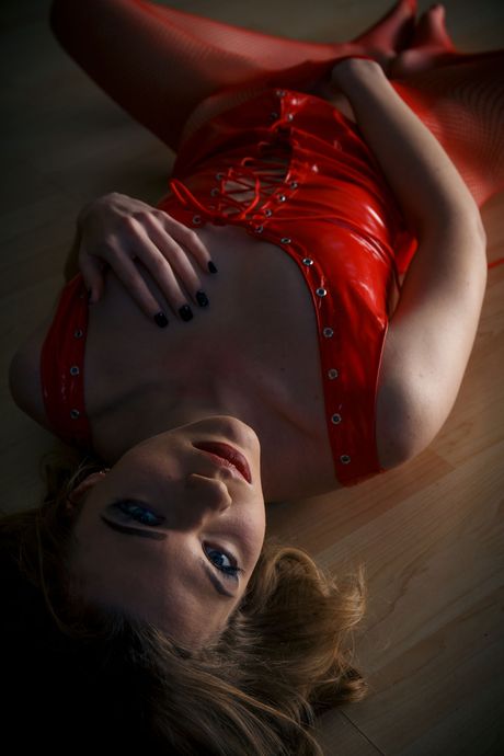 Hot teen Mia Luna removes red lingerie to pose nude in fishnet pantyhose