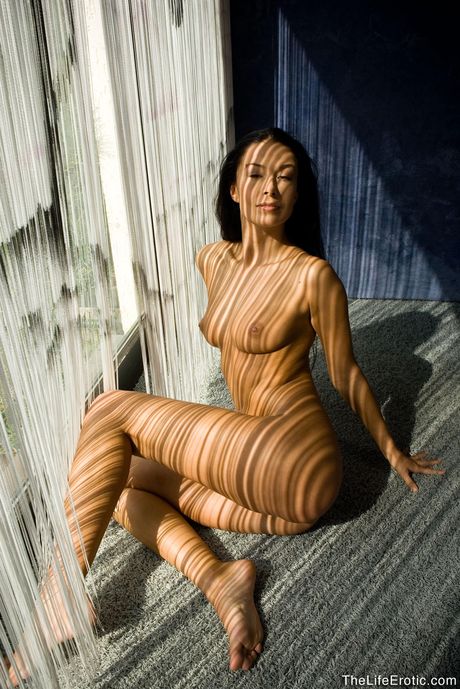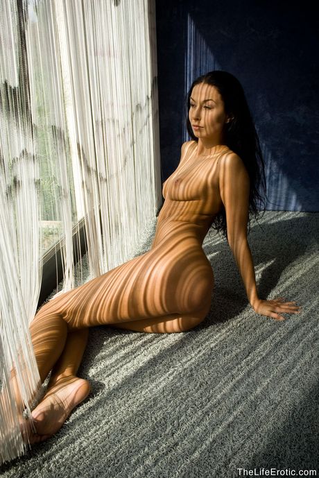 Innocent teen Hanka poses naked on a rug while showing her pierced nipples