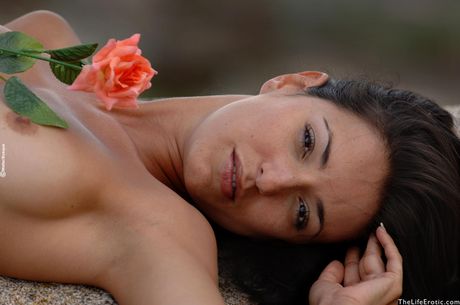 Lean teen Kira poses naked in the garden with a bouquet of flowers