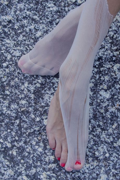Lesma takes off her pantyhose and exposes her tattooed body in the outdoors