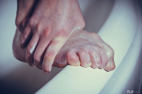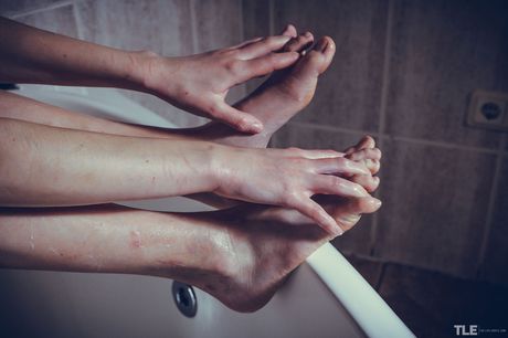 Lina takes off her pantyhose and bra and starts to masturbate her pussy