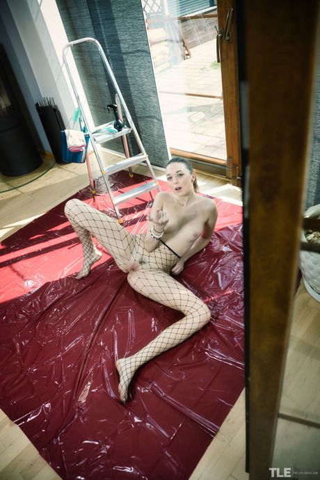 Lovely teen Isabela Delaa removes fishnet pantyhose before fingering her pussy